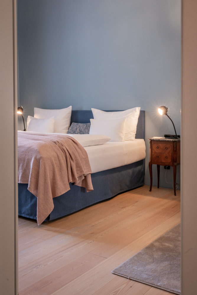 Ca. 65m² suites with 2 separate bedrooms. Self-assured color and wallpaper themes coupled with restoration of historically listed elements. Timeless furnishing design curated by POLKA, on long, roughly textured spruce floorboards. Perfect rooms for families or friends.