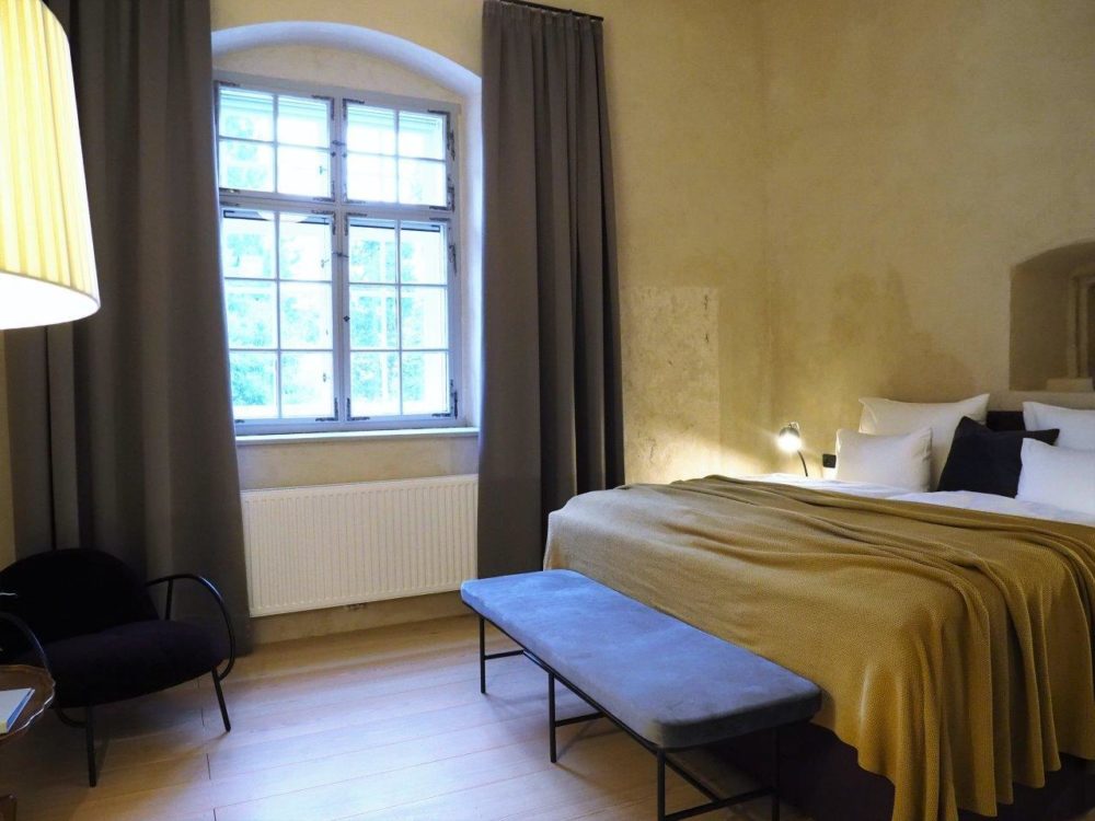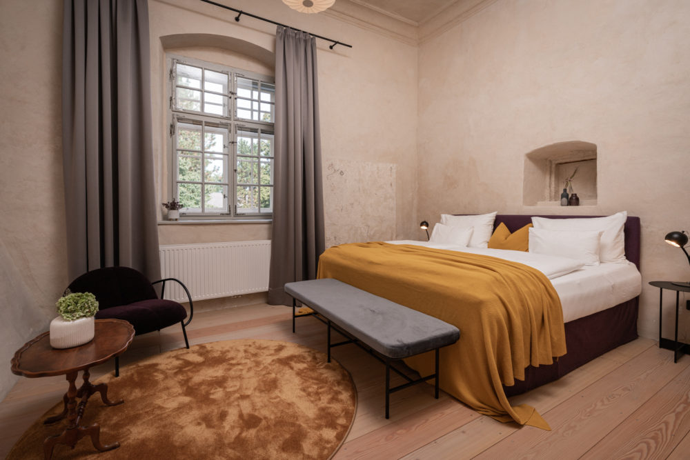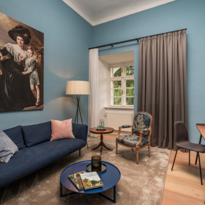 Ca. 55m² suite. Located above the imposing chimney flue of the former castle kitchen, the dimensions can be envisaged based on the impressively slanted fireplace walls. A magnificent symbiosis of historically listed, restored murals and the elegant signature-design of POLKA. Beautiful salon facing the arcaded walkway and a separate bedroom overlooking the Arboretum. Semi-open bathroom with bathtub.