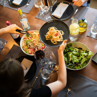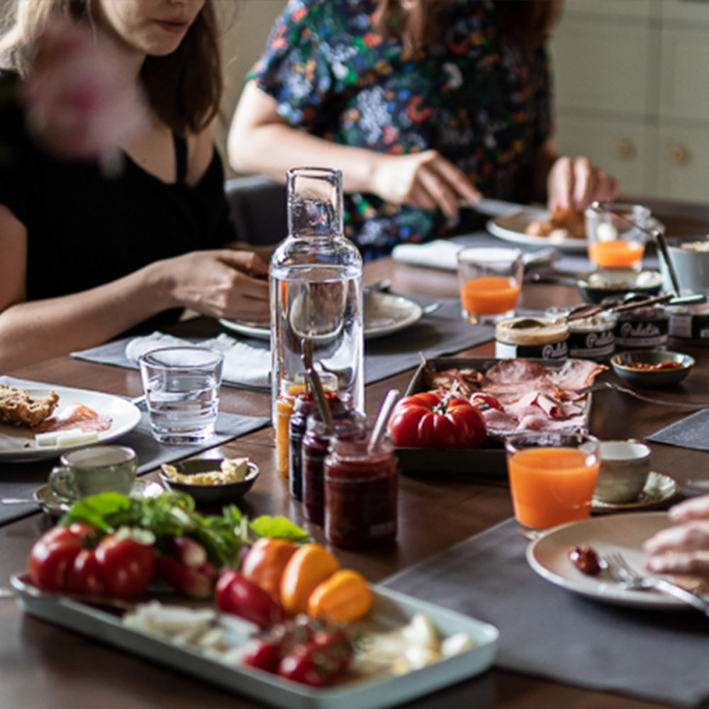 Ein großer Tisch, eine gut ausgestattete Küche, ein gemütliches Umfeld. Der Kochsalon bildet den Mittelpunkt des Gästehauses. Hier wird das Frühstück serviert und auf den Tisch kommt, was rundum so wächst und erzeugt wird: Säfte, Eier, Wurst, aber auch Ziegenkäse und Süßes aus der Region. Obst und Gemüse, je nach Jahreszeit, sogar aus dem eigenen Garten. Und wer den würzig-frischen Geschmack liebt, verfeinert seine Eierspeise mit Wildkräutern aus dem Park oder kombiniert mit Produkten aus dem Bio-Landgut Esterhazy. Und wenn im Sonnenland die Sonne scheint, dann wird auch gerne draußen gegessen. Auf der Terrasse im Garten, mitten im Grünen.