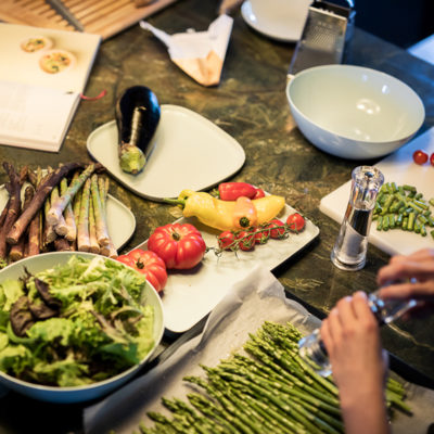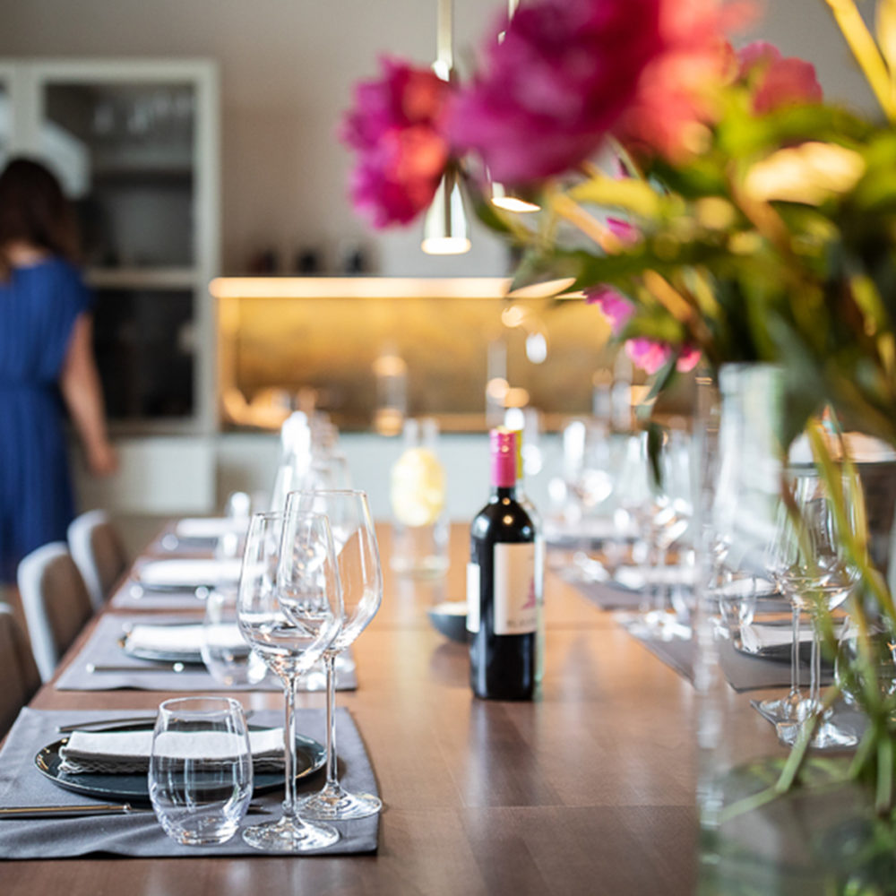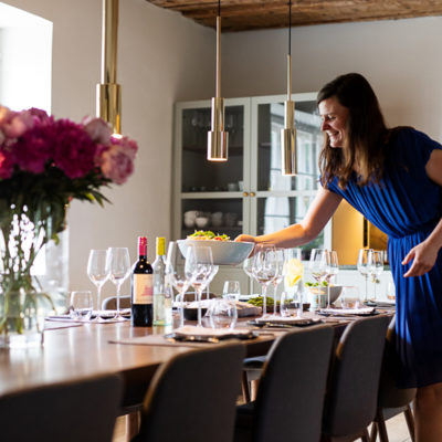 Kulinarisches Zentrum des Gästehauses ist der Kochsalon. Hier wird das Frühstück serviert. Hier wird aber auch gekocht. Denn die gut ausgestattete Küche ist groß genug, um Kochseminare abzuhalten. Oder um sich abends selbst eine Kleinigkeit zuzubereiten.