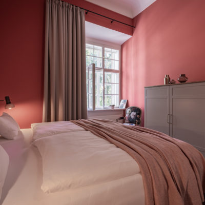 Ca. 55m² suite. Located above the imposing chimney flue of the former castle kitchen, the dimensions can be envisaged based on the impressively slanted fireplace walls. A magnificent symbiosis of historically listed, restored murals and the elegant signature-design of POLKA. Beautiful salon facing the arcaded walkway and a separate bedroom overlooking the Arboretum. Semi-open bathroom with bathtub.