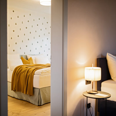 Ca. 65m² suites with 2 separate bedrooms. Self-assured color and wallpaper themes coupled with restoration of historically listed elements. Timeless furnishing design curated by POLKA, on long, roughly textured spruce floorboards. Perfect rooms for families or friends.